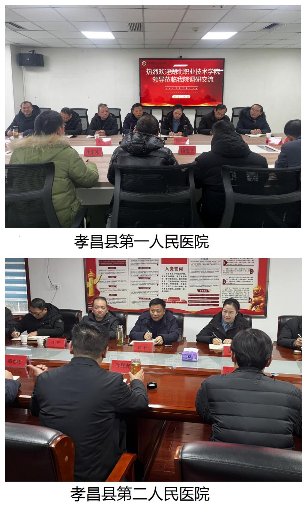 在孝昌县第一人民医院和孝昌县第二人民医院,调研团队详细了解了医院的发展历程、现状及未来规划,并就实习学生管理、教学同质化、优化课程体系及提升学生实践能力等问题与医院进行了深入探讨。