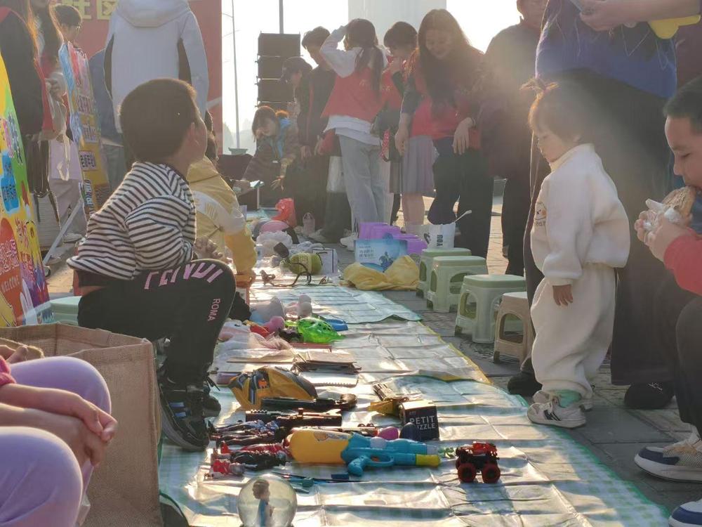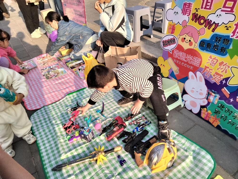 上午8时,晨曦微露的广场已热闹起来。居民们带着精心整理的闲置好物,在志愿者热情指引下有序签到;同学们早早集结,扛展板、搬物资、运用品,与社区志愿者并肩协作,搭摊位、划区域、贴海报、摆道具,分工明确、干劲十足,空旷场地很快布置得井然有序。