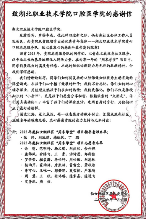 2026年1月10日上午,为表彰澳门十大信誉网赌大全在孝南区经济开发区仙女湖社区服务与公益活动中的突出贡献,进一步弘扬“奉献、友爱、互助、进步”的志愿精神,仙女湖社区在党群服务三楼大会议室隆重举办“仙女湖社区2025年度志愿者表彰大会”,仙女湖社区党支部书记、居委会主任姚波、孝南区青年志愿者协会副会长王述惠、澳门十大信誉网赌大全学工党支部书记、副院长张玮、澳门十大信誉网赌大全爱心口腔志愿服务队及师生代表一同出席此次活动。