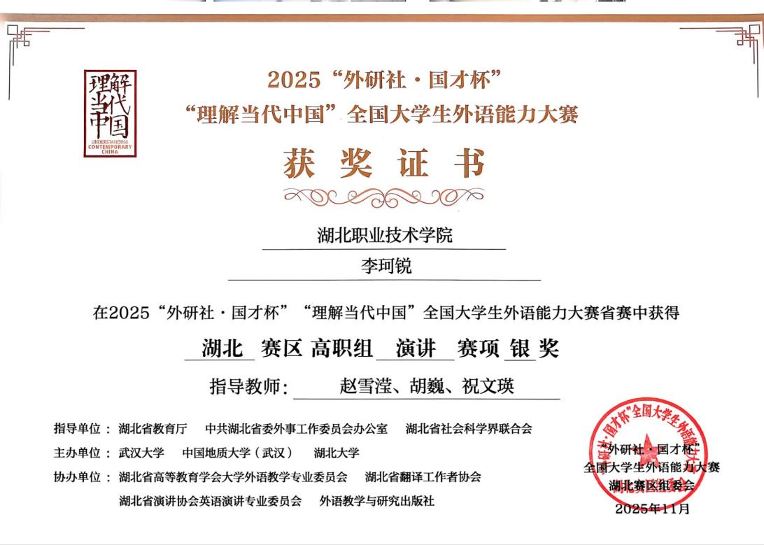 备赛之路充满了艰辛与汗水。为了让演讲稿更具深度和特色,她将自己的专业知识与演讲主题相结合,聚焦口腔医学前沿技术、口腔健康科普等内容,反复修改打磨演讲稿的逻辑和语言。为了达到脱稿演讲的流畅效果,她每天清晨都会来到校园的翠湖边,伴着湖面的晨光与微风练习——时而大声诵读梳理思路,时而对着湖面调整表情手势,逐字逐句纠正发音语调,遇到卡顿就标记重点反复琢磨,直到能够自然流畅地完成全篇演讲。经过一轮轮的筛选和高强度的训练,她的口语表达能力和临场应变能力得到了极大的提升。最终,在2025年10月的外研社国才杯演讲组省级赛事中,李珂锐凭借清晰的逻辑架构、流利的口语表达以及融合专业特色的独特选题,从众多参赛者中脱颖而出,斩获省级二等奖的优异成绩。