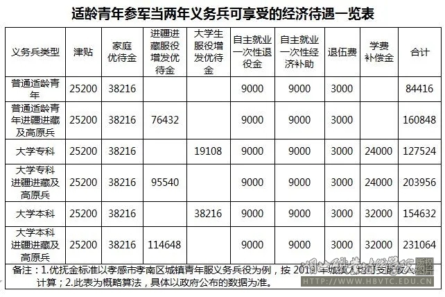 适龄青年参军当两年义务兵可享受的经济待遇一览表